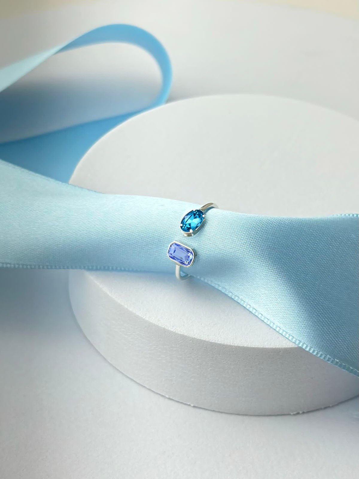 Suavidade com personalidade. A combinação do cristal oval azul com o octagonal azul cria um equilíbrio encantador de cores frias, perfeito para quem busca elegância e autenticidade. O aro aberto traz um toque contemporâneo e confortável, ideal para o dia a dia ou ocasiões especiais.