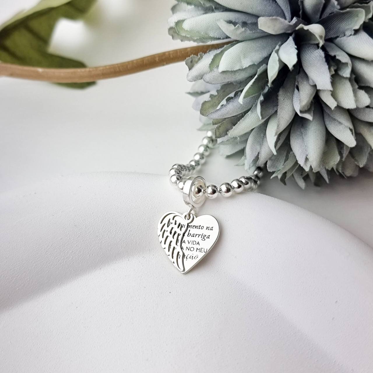 O Berloque de Prata Coração Duplo Anjinho Personalizado em é uma peça emotiva e especial. Este Berloque de Prata apresenta um coração delicado com a frase "Um momento na minha barriga, uma vida inteira no meu coração" gravada, simbolizando o amor eterno por um filho. A peça é acompanhada por um segundo Pingente de Prata no formato de uma asa, que cobre metade do coração, adicionando um toque de proteção e ternura. Feito em de alta qualidade, garante durabilidade e um brilho refinado. Perfeito para mães ou para quem deseja carregar uma lembrança significativa, este Berloque de Prata é uma adição única e tocante à sua coleção de joias.