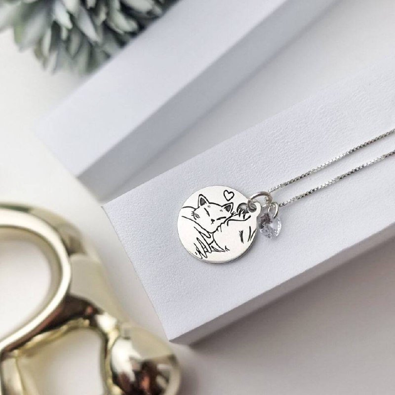 Colar de Prata Patuá Medalha Beijo Gatinho e Zircônia